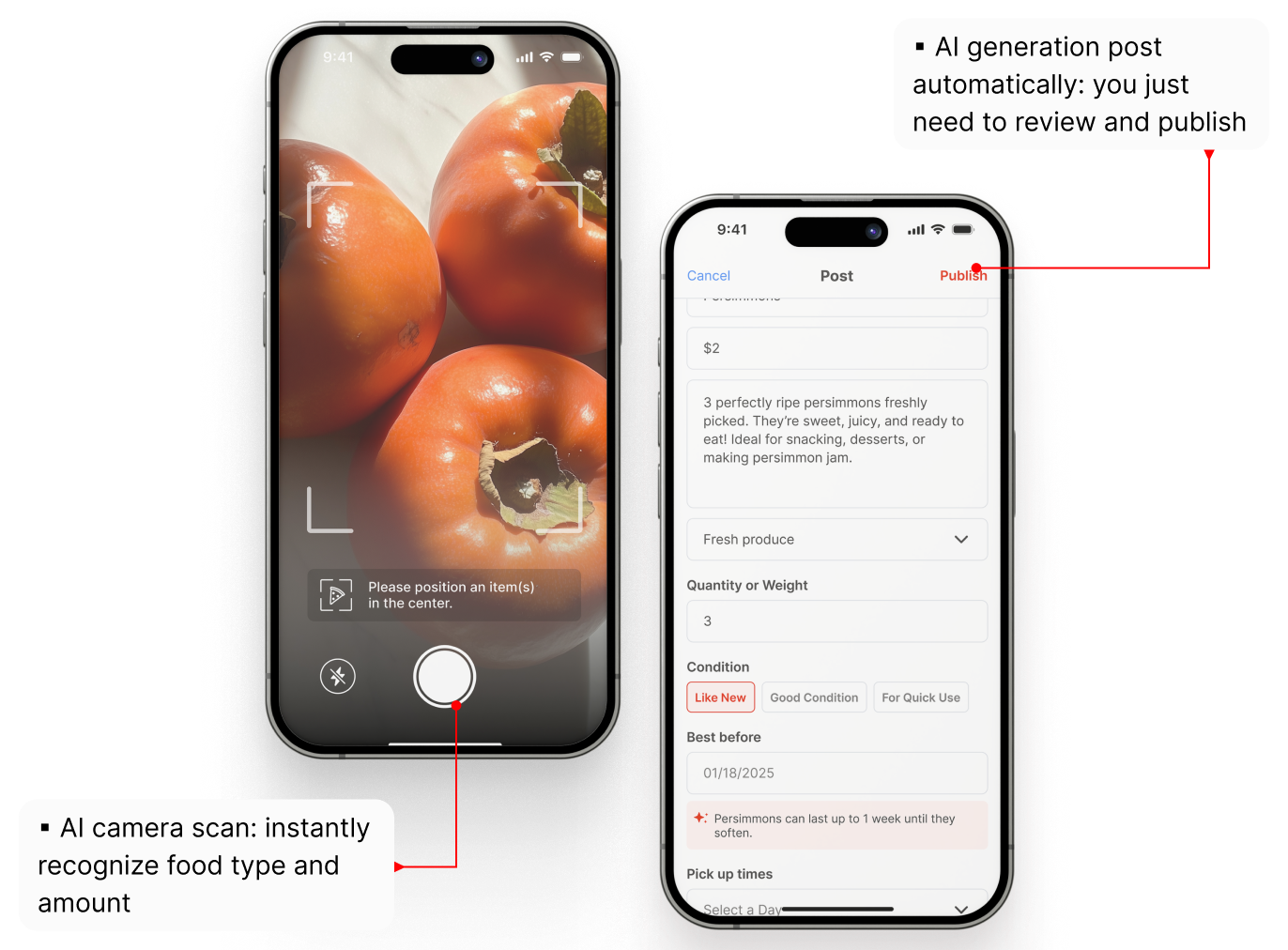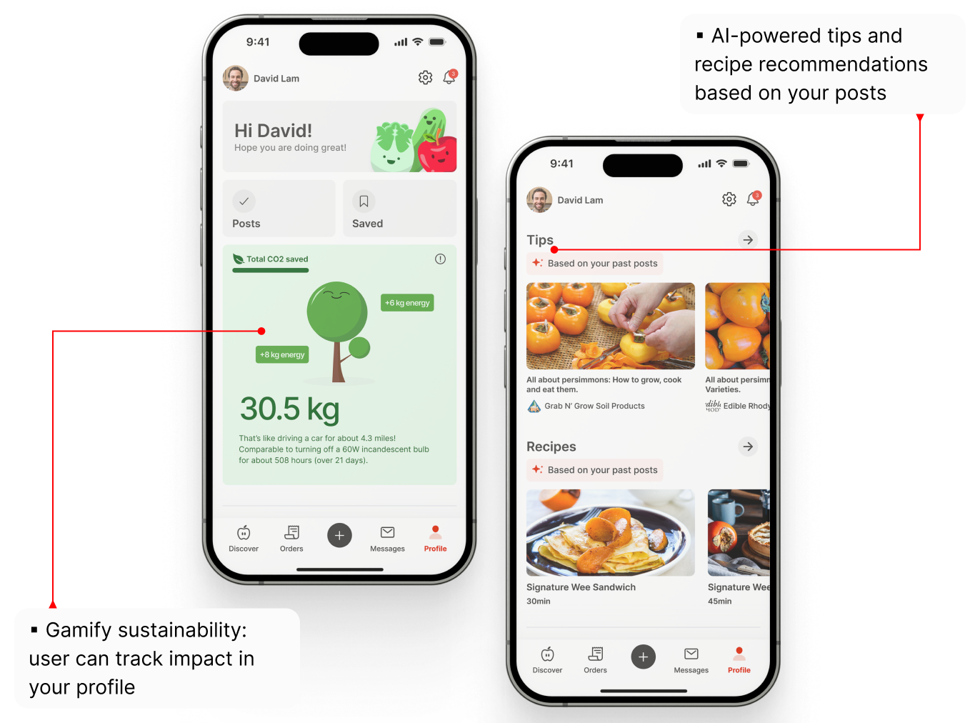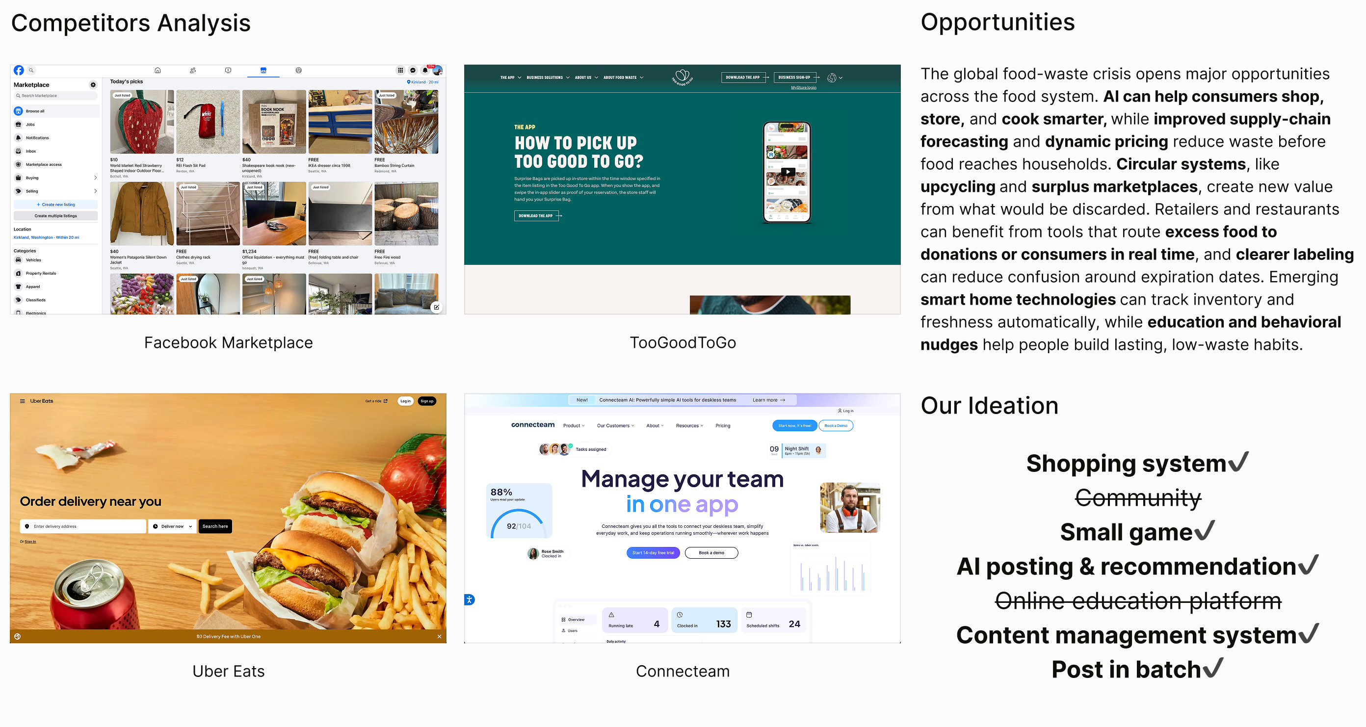I identified AI and gamification as major opportunities, introducing AI-powered posting feature that scans single or multiple food items and auto-generates posts after capturing an image. Additionally, I integrated green energy rewards to boost engagement and raise awareness about reducing surplus food.