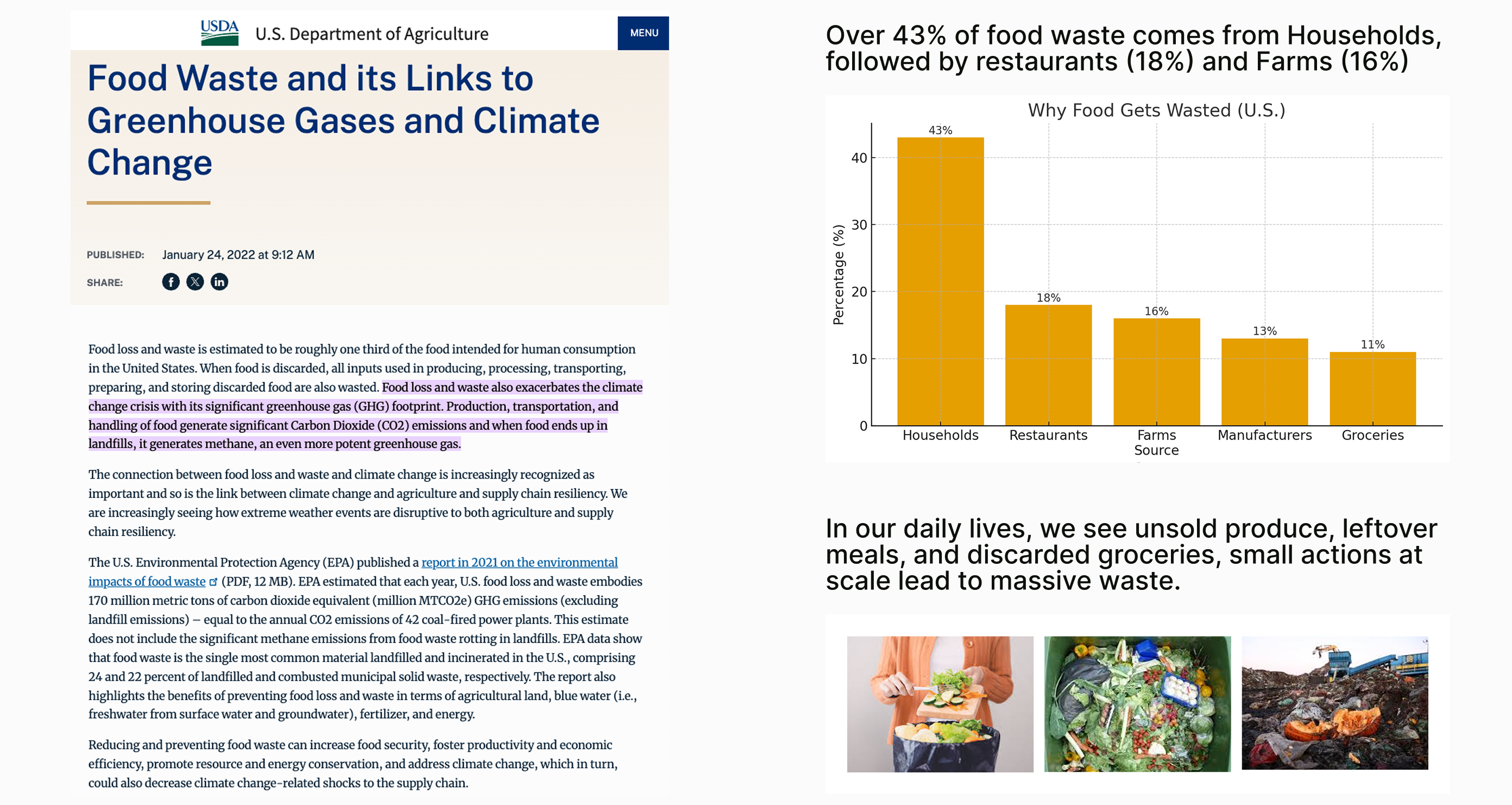 Why food waste matters? 170 millions metric tons CO2 yearly (EPA), food waste = emissions from 42 coal plants, 30% -40% of U.S. food wasted (USDA)