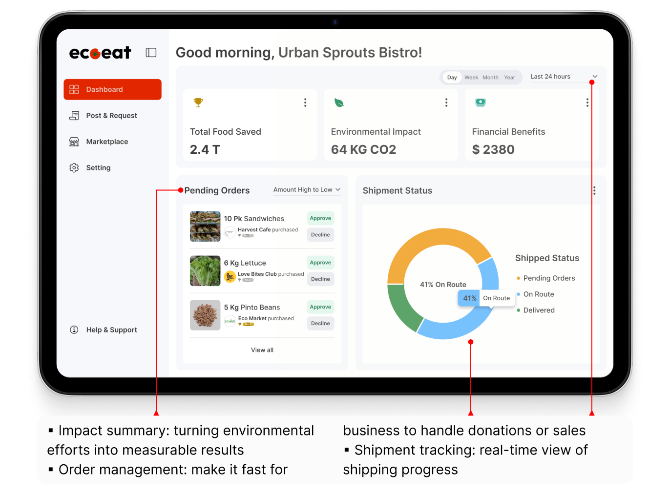 EcoEat makes reducing food waste simple, accessible, and impactful. It’s a platform where businesses and individuals connect to sell, donate, or find surplus food with ease. Designed for maximum efficiency, EcoEat empowers users to act sustainably without added complexity. For individuals, EcoEat is a tool for giving or finding food locally. With an AI assistant, users can quickly post surplus food by simply snapping a photo, no tedious forms, no confusion. Gamified features track the weight of food saved and calculate the positive environmental impact, turning sustainability into an engaging experience. Businesses benefit from advanced tools like bulk uploads and AI-driven suggestion, making it easy to manage surplus inventory and connect with bulk buyers or charitable organizations.