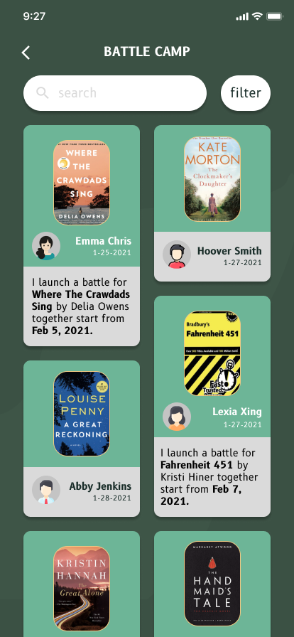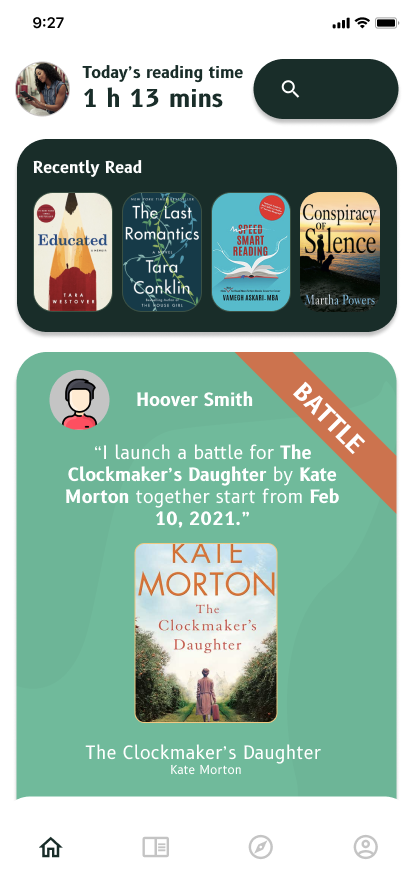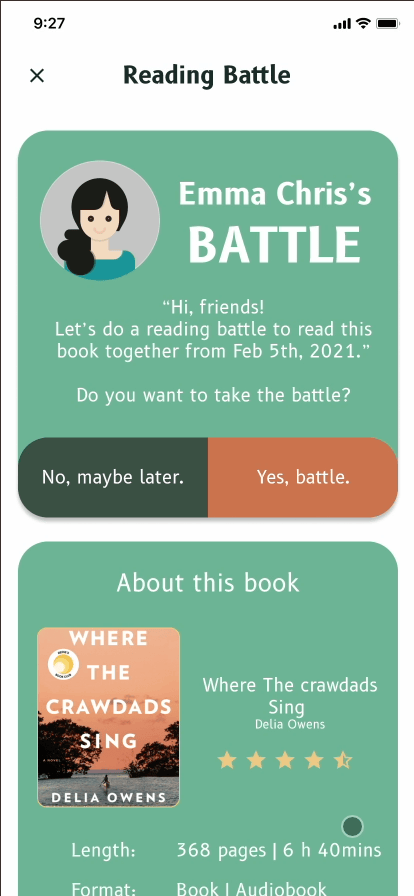 Reading Battle is a social motivation feature that encourages users to build consistent reading habits through friendly competition. Users can initiate or accept reading challenges with friends, or be matched with random readers, making participation easy and inclusive. By turning book completion into a shared goal, Reading Battle adds accountability, excitement, and momentum to the reading experience.