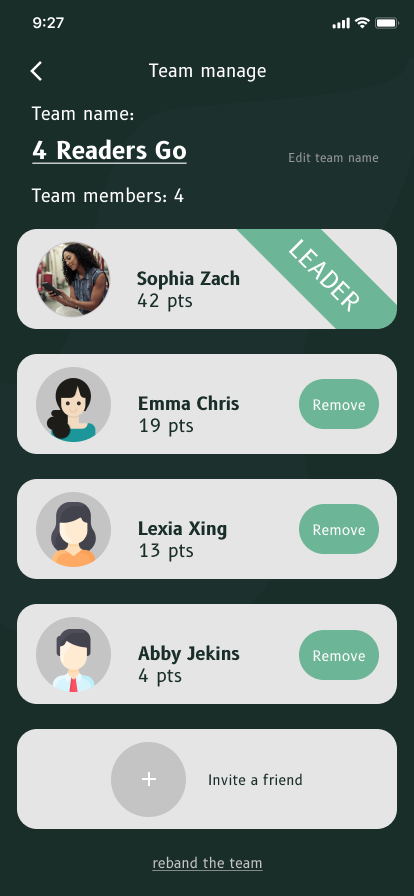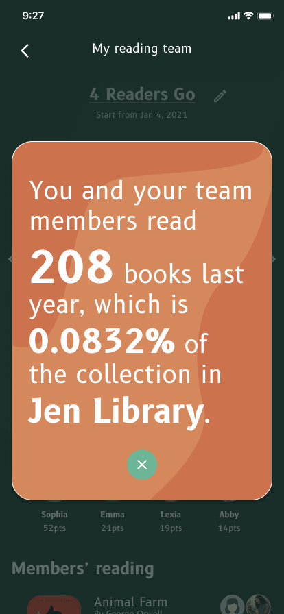 Reading Team is a collaborative feature designed to motivate users, foster social connection, and support long-term reading habits. Users can create or join teams of up to five members and work together toward shared goals based on total reading time. As teams accumulate reading minutes, they earn virtual rewards and scores, encouraging accountability, teamwork, and consistent engagement.