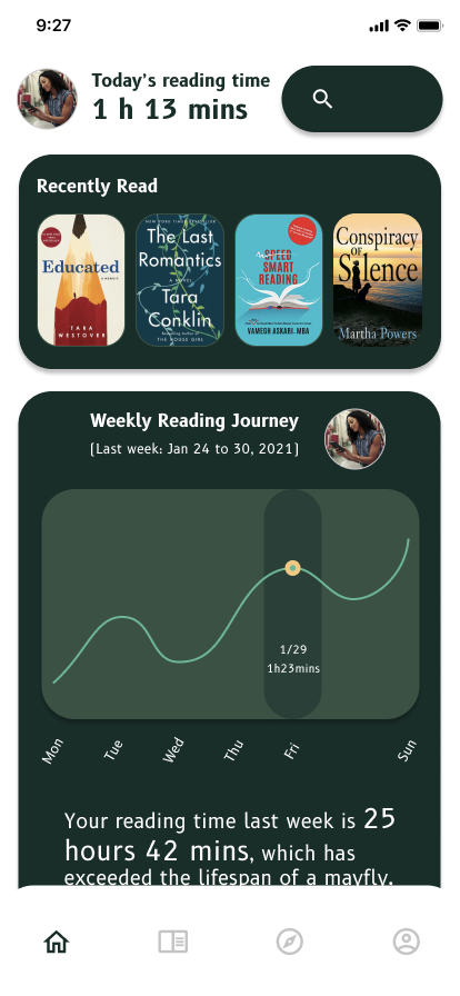 Reading Track helps users build self-awareness around their reading habits by visualizing reading time and book completion through daily, weekly, and monthly reports. By combining clear data views with encouraging insights, the feature supports reflection while motivating consistent reading behavior.