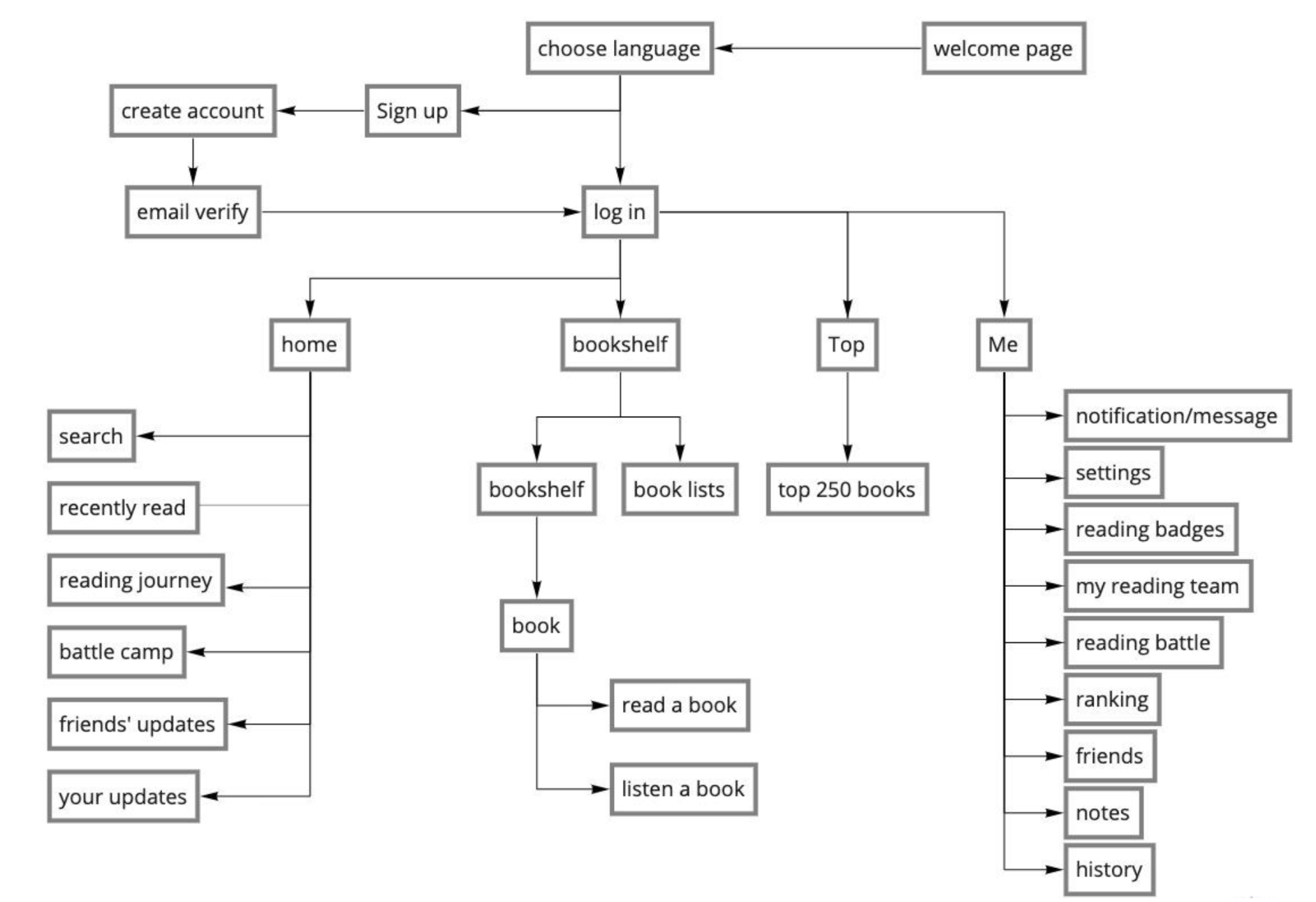 It is my goal to create a functional reading app that stores ebooks and also serves as an online community. To build it, there are a lot of details to consider, and this chart can help me plan the structure.